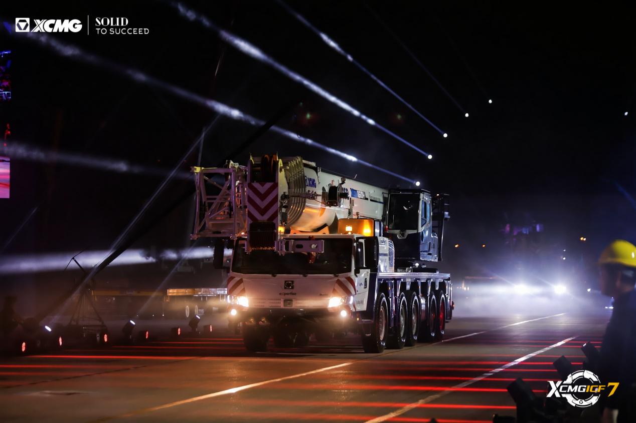 16臺起重機列陣如虹,XCA900L8—1全地面起重機領銜,輪式與履帶產品組成“鋼鐵艦隊”。車隊駛過觀禮臺,客戶紛紛舉起手機定格畫面,客商高呼:“Amazing!”鳴笛聲中,設備駛向全球,燈光在夜幕中匯成“時光隧道”,照亮遠征之路。