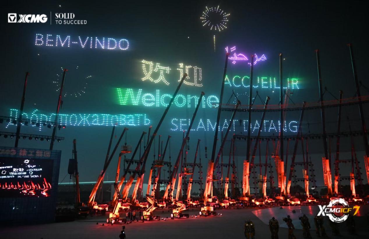 2000架無人機以多種語言展示歡迎詞,通過不停變換的徐工元素、徐州文旅元素突出徐州工程機械夜文化特色,編織了一幅“助建綠色美好未來”的壯美畫卷。