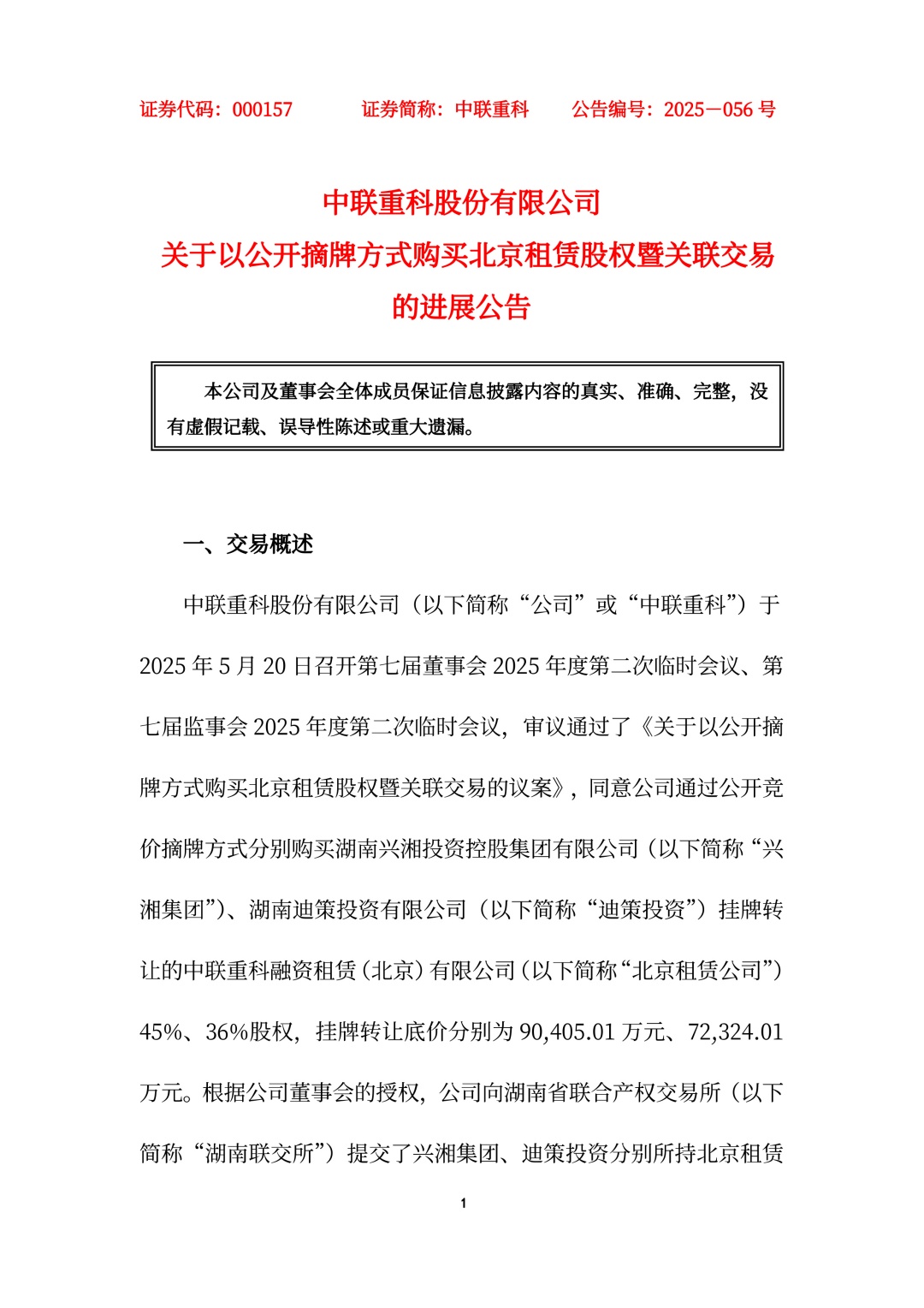 中聯重科股份有限公司(以下簡稱“公司”或“中聯重科”)于2025 年 5 月 20 日召開第七屆董事會 2025 年度第二次臨時會議、第七屆監事會 2025 年度第二次臨時會議,審議通過了《關于以公開摘牌方式購買北京租賃股權暨關聯交易的議案》,同意公司通過公開競價摘牌方式分別購買湖南興湘投資控股集團有限公司(以下簡稱“興湘集團”)、湖南迪策投資有限公司(以下簡稱“迪策投資”)掛牌轉讓的中聯重科融資租賃(北京)有限公司(以下簡稱“北京租賃公司”)45%、36%股權,掛牌轉讓底價分別為 90405.01 萬元、72324.01萬元。根據公司董事會的授權,公司向湖南省聯合產權交易所(以下簡稱“湖南聯交所”)提交了興湘集團、迪策投資分別所持北京租賃公司 45%、36%股權的摘牌申請。2025 年 5 月 28 日,公司與興湘集團簽署《產權交易合同》,股權轉讓價款為 90405.01 萬元。2025年 6 月 4 日,公司與迪策投資簽署《產權交易合同》,股權轉讓價款為 72324.01 萬元。